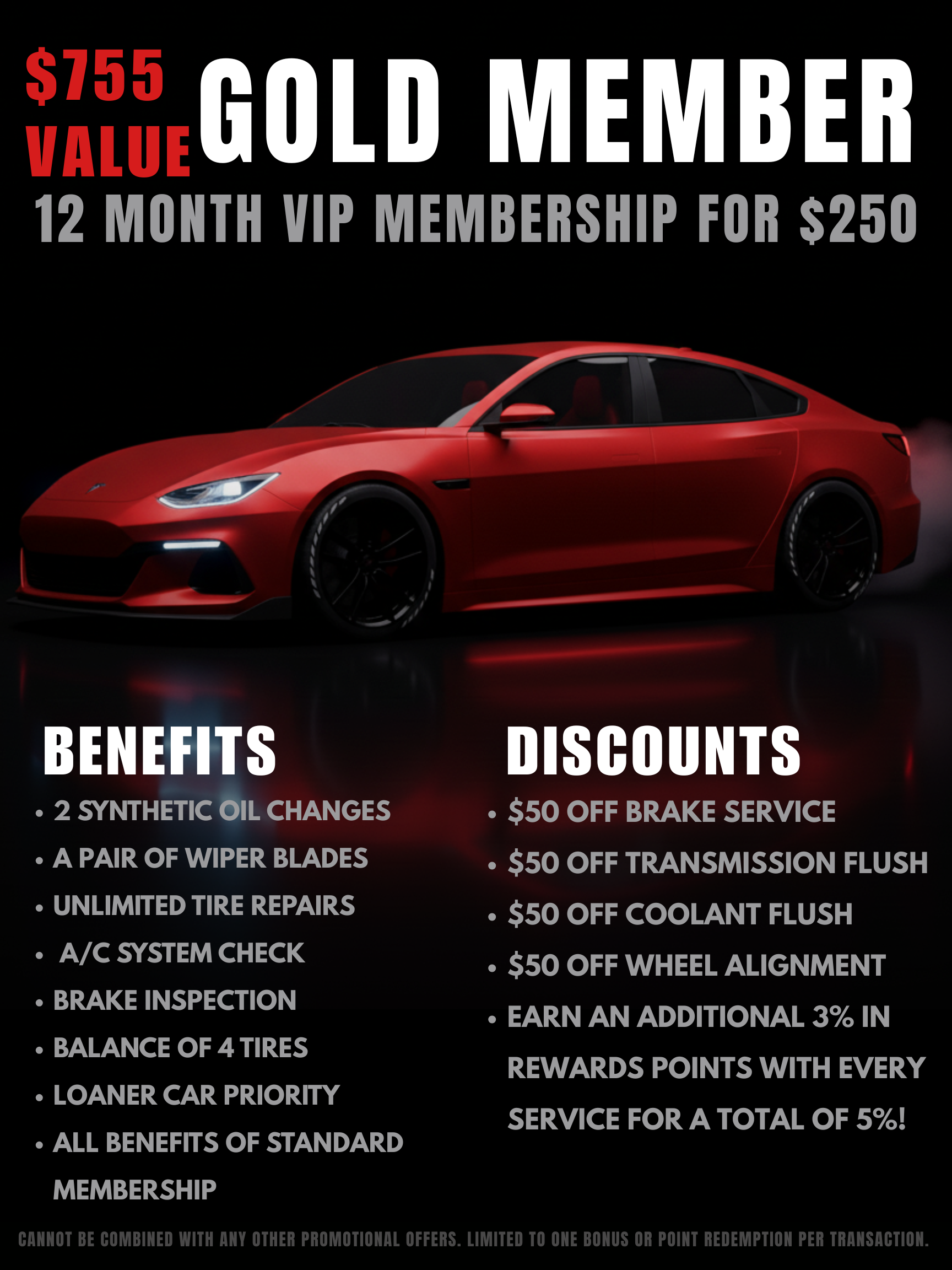 Experience premium care and exceptional savings with our Gold Member VIP Program. Designed for drivers who want year-round protection and unmatched value, this membership delivers over $755 worth of services for just $250.